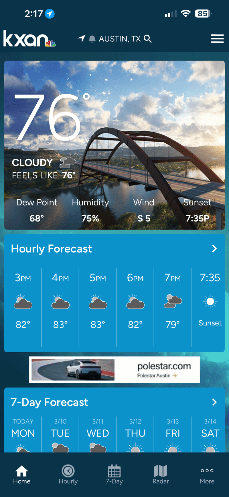 The most significant functional and aesthetic change was the addition of live weather states, represented by an evolving image of the Pennybacker Bridge, an Austin landmark. If the current conditions are sunny, that is reflected in the image. Likewise, if it’s raining, you’ll see rain.